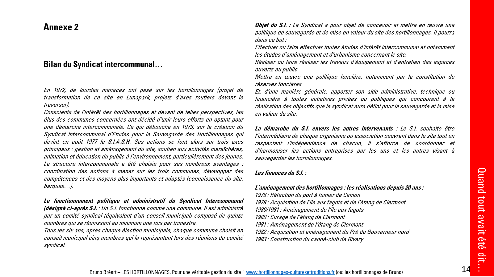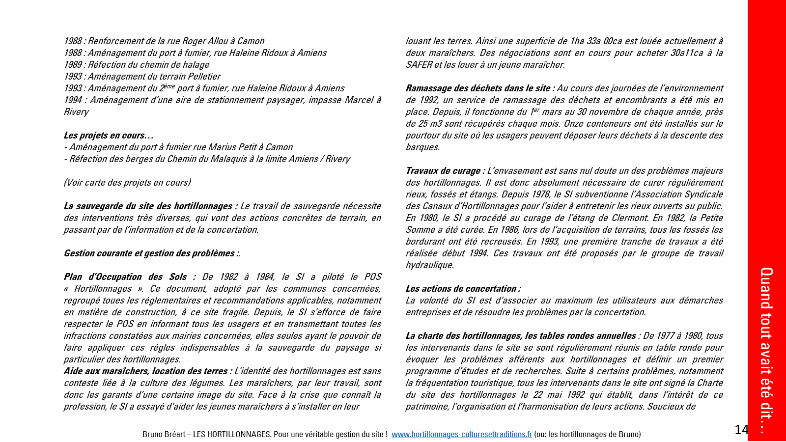 - Historique du Syndicat Intercommunal pour l'aménagement et la sauvegarde des Hortillonnages. Voir notre page: Bilan du SIASH *