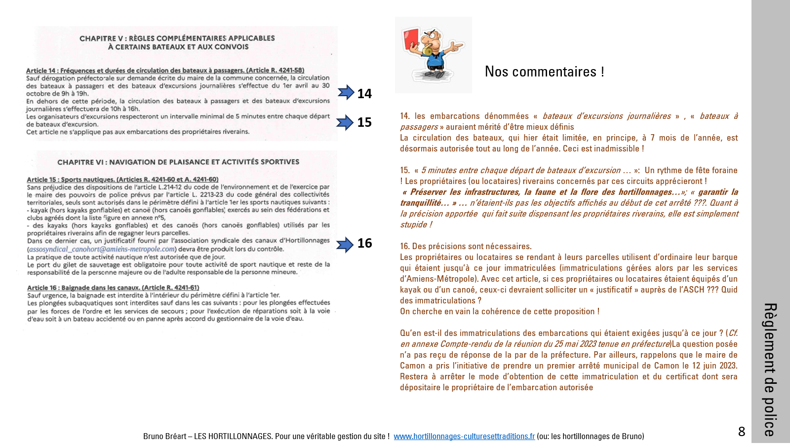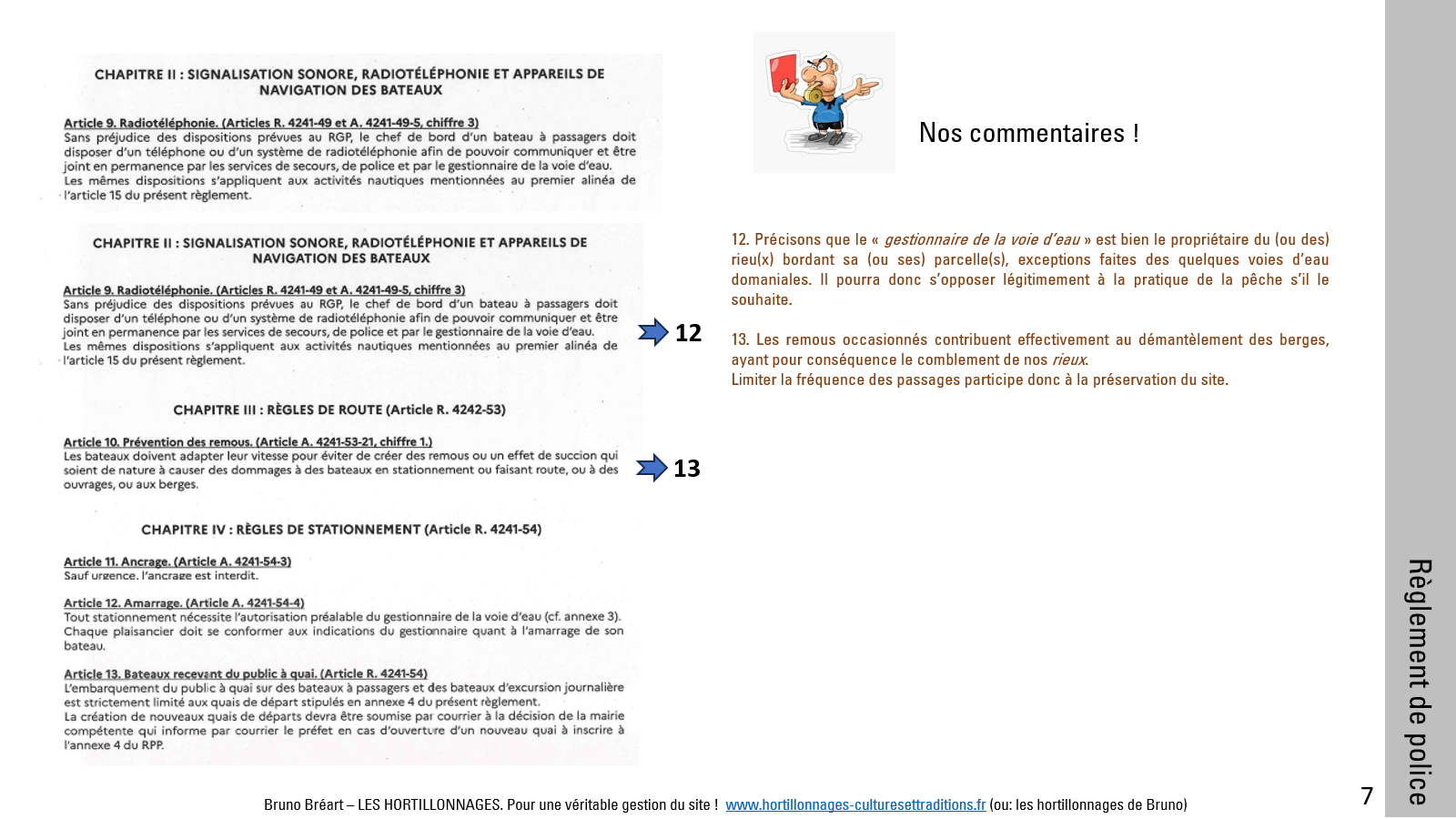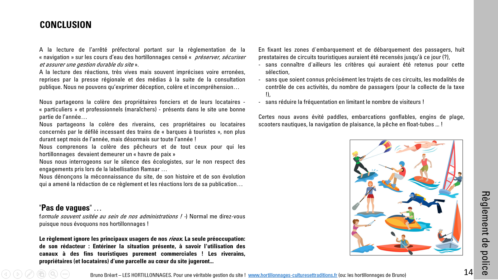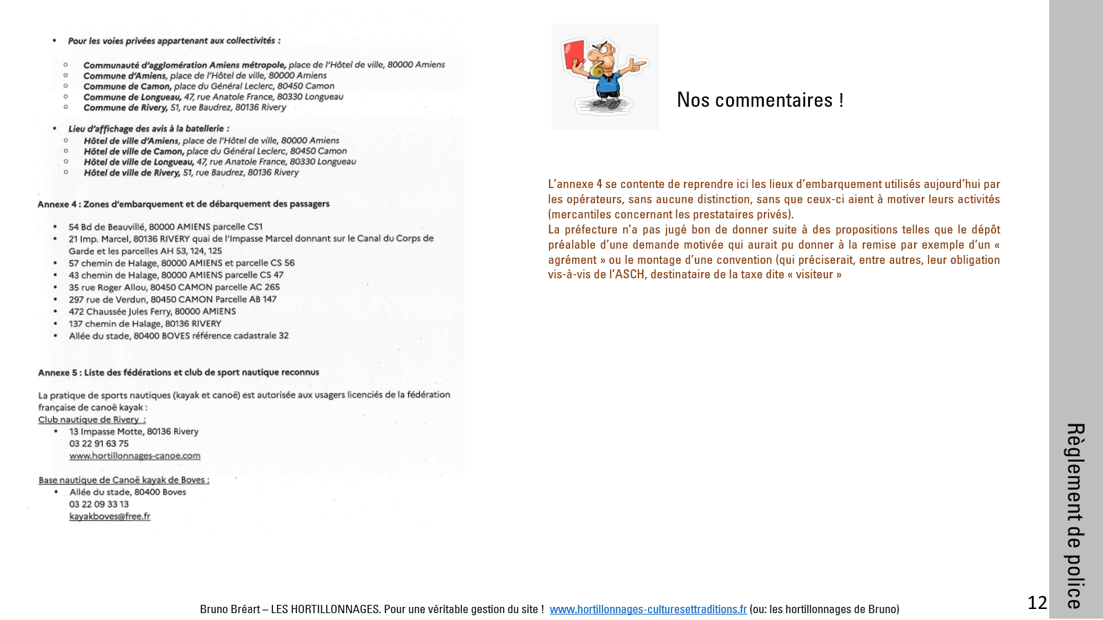Le règlement ignore les principaux usagers de nos rieux. La seule préoccupation: du rédacteur a été d'entériner la situation présente, une situation que nous dénonçons depuis plusieurs années, à savoir l'utilisation des canaux à des fins touristiques purement commerciales ! Les riverains jugeront...